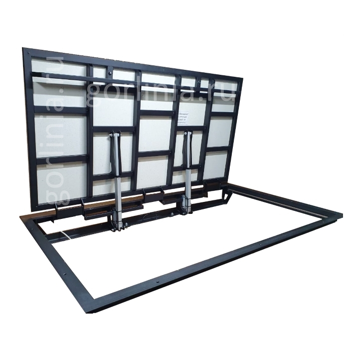 При постановке крышки на стопор в режиме ручного открывания исключить возможность использования привода.Изделие отгружается с установленными подъемниками и соединительными проводами. Актуаторы выставлены соосно и отрегулированы с контрольным пуском инженером по качеству изготовителя. Снизу по стороне шарниров стоит кронштейн на направляющих. Узел выставляется и крепится в торец плиты пола, а также к реактивной планке после установки при поднятой крышке согласно инструкции.