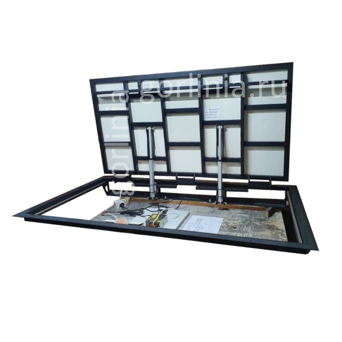 Механизм в любой момент открывается в ручном режиме при этом не скалывая, не ломая плитку, которой облицовывается поверхность. Для этого Вы ввинчиваете резьбовые Т-образные ручки и поднимаете створку на шарнирах до полной разгрузки обесточенных подъемников. В случае если Вы открыли люк вручную и поставили на стопор актуаторы, закройте его также вручную, а потом начинайте пользоваться мотором.