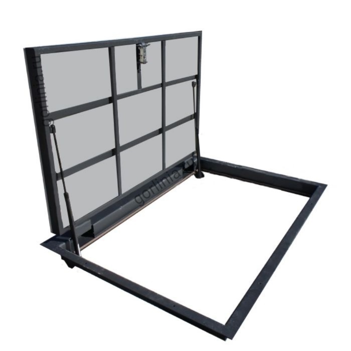 Конструкция смещенного за ось шарнирного соединения убирает сквозняк из подвала, сохраняя проем лаза в чистоте 1050х800.