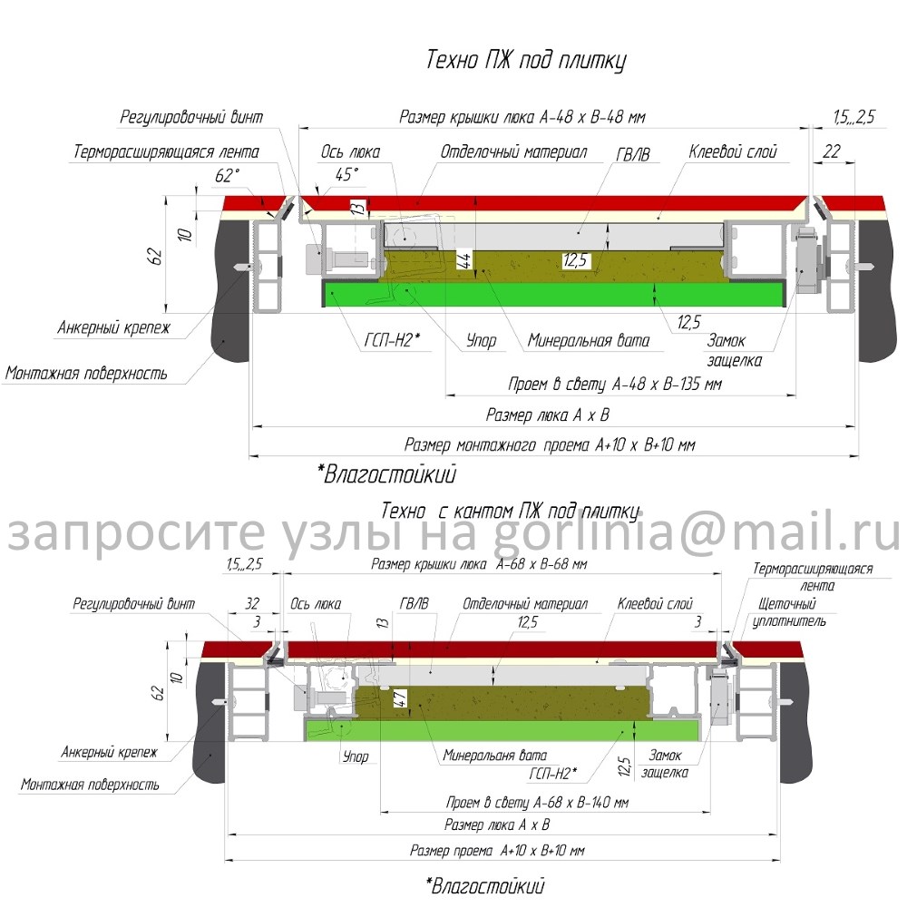 Алюминиевая коробка с порогом собирается на оцинкованных закладных деталях с навеской створки на осевых петлях с одной осью вращения. Положение люка регулируется по вертикали, горизонтали и глубине посадки на всем протяжении эксплуатации изделия.