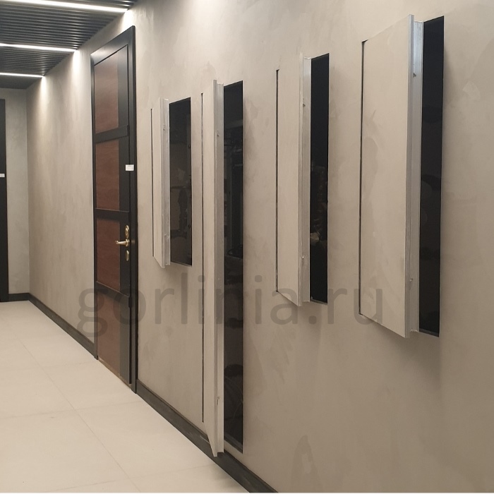 Заполнение лицевой части полотна влагостойким гипсокартоном под одностороннее шпатлевание, финишное колерование, наклейку обоев. Слой базальтовой ваты подшивается огнестойким гипсокартонным листом ГСП-DF. По контуру притвора проложен термоактивный ленточный уплотнитель.