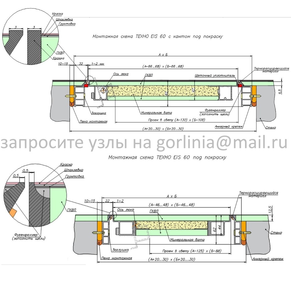 В исполнении с сертифицированным пределом огнестойкости EIS60 по контуру примыкания проклеивают терморасширяющийся материал, в створке прокладывают рулонный минеральный утеплитель и подшивают вторым слоем гипсокартона с тыльной стороны.